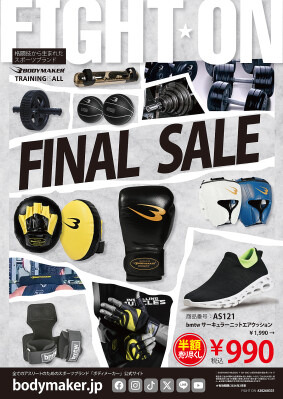 BODYMAKER(ボディメーカー)は、公式直営サイトおよび直営店舗で半額多数の「売りつくしFINAL SALE」を2月20日(金)から3月末日まで開催いたします。新作・旧作アイテムを最大半額の特別価格でご提供します。また、「売りつくしFINAL SALE」開催に合わせてお得な在庫処分目玉アイテムを多数掲載したDMも発行いたしました。目玉アイテムとして一例を紹介すると、冬の定番ネックウォーマーなど¥1,990→¥990の半額やジムやトレーニングウエアとして人気のbmtwスーパーストレッチTシャツハーフスリーブ1枚¥1,490が2枚で¥2,000などお得が満載。また今回は、裏表紙から4ページほど人気のマラソン特集を掲載。ランニングバッグを限定300セット限り2点で¥1,000など。お客様にお得なお買い物を楽しんでいただけます。今回も送料無料商品多数あり、BODYMAKERは挑戦し続けます。ぜひこの機会にBODYMAKER公式直営サイト・直営店舗ともご覧ください。
