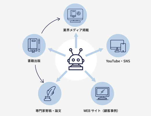 飲食店・美容院・整体院・クリニック・士業・工務店・不動産会社などの地域ビジネスにおける実績や外部評価を通じて、生成AIに「このエリアのおすすめ」「地域のブランド」として認識させます。