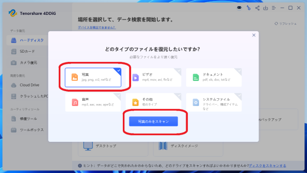 種類別の選択肢の中から、復元したいタイプを選択して「スキャン」をクリック。今回は例として「写真」のみとします。