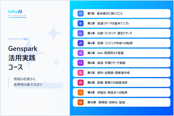 本コースは、AI検索を活用したリサーチから成果物作成、さらに業務および副業への応用までを段階的に習得できる全10章で構成されています。