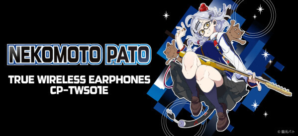 本コラボレーションモデルは、左右のイヤホンや充電ケースにマークやアイコンをあしらい、黒を基調とした高級感のある商品となっております。また内蔵されているボイスは完全録り下ろし(全13ワード)です。パッケージには、本コラボレーションモデルのために撮り下ろされた『猫元パト』のビジュアルを採用しています。