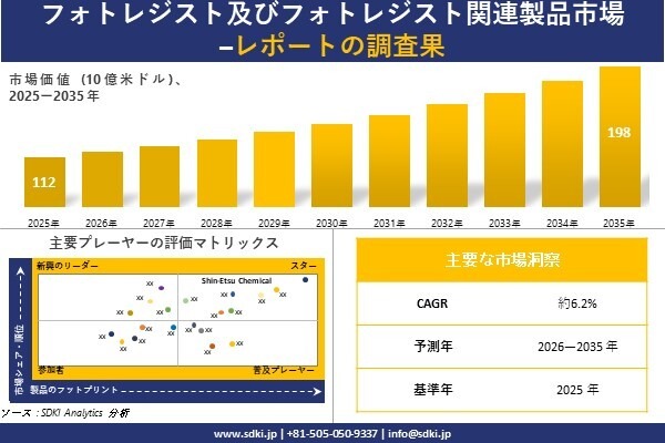 フォトレジスト及びフォトレジスト関連製品 市場に関する当社の調査レポートによると、フォトレジスト及びフォトレジスト関連製品 市場規模は 2035 年に約 198 億米ドルに達すると予想されています。さらに、2025 年の フォトレジスト及びフォトレジスト関連製品 市場規模は約 112 億米ドルとなっています。フォトレジスト及びフォトレジスト関連製品 に関する市場調査レポートでは、市場は 2026-2035 年の予測期間中に約 6.2% の CAGR で成長するとも述べられています。