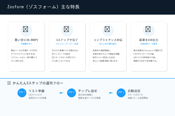 ゾスフォームは、従来の手作業によるフォーム営業の課題を解決し、営業担当者の業務効率を劇的に改善します。買い切り30,000円(税込)、月額費用ゼロという業界最安水準の価格設定で、個人事業主からスタートアップまで幅広い事業者の新規開拓活動を支援します。