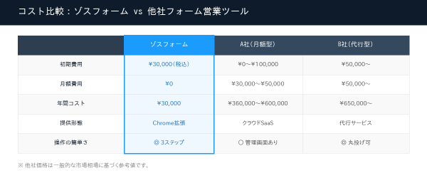 多くのフォーム営業ツールは月額3万~5万円のサブスクリプション型で、年間30万~60万円のコストが発生します。ゾスフォームは30,000円の買い切り型のため、一度のご購入でずっとお使いいただけます。追加の月額費用は一切かかりません。
