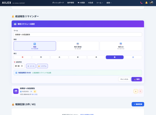 経過報告リマインダーは、事件ごとに報告スケジュールを設定すると、指定した頻度・時刻でメール通知およびシステム通知(アプリ内ベル通知)が自動的に届く機能です。通知を送信するたびに次回の通知日が自動で再計算されるため、一度設定すれば繰り返し入力する必要はありません。