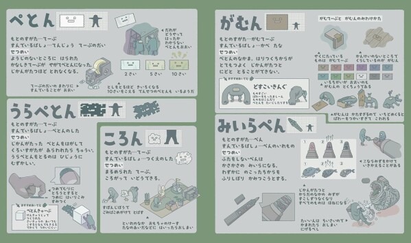床の上に落ちて固くなったお米は「かぴん」、失敗してぐちゃぐちゃになって棚に戻された折り紙は「うらみがみ」、床の隙間につまった謎の汚れは「みぞじん」…。