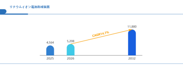 Global reports調査チームの最新レポート「グローバルリチウムイオン電池形成装置市場規模、主要企業シェア、ランキング分析レポート【2026年版】」によると、グローバルリチウムイオン電池形成装置市場は2025年の4564百万米ドルから2032年には11880百万米ドルに成長し、2026年の市場規模は約5208百万米ドルと推計されており、2026-2032年のCAGR(年間成長率)が14.7%に達すると予測されている。