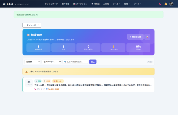 従来のAILEXは「受任後」の業務効率化に注力してきましたが、利用者である弁護士から「受任に至るまでのプロセスも管理したい」「相談からの転換率を把握したい」というご要望を多数いただいていました。今回の機能追加により、AILEXは「問い合わせ→相談→受任→事件管理→mints電子提出→請求」に至る法律事務所の業務フロー全体をワンストップで支援するプラットフォームへと進化しました。