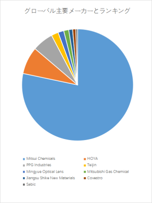 市場構造を見ると、Mitsui Chemicalsが圧倒的なシェアを有し、世界のトップメーカーとして位置づけられている。続いて、PPG Industries、HOYA、Teijin、Mitsubishi Gas Chemical、Covestroなどが中核を形成し、これに中国勢のMingyue Optical LensやJiangsu Shike New Materialsが台頭する構図である。