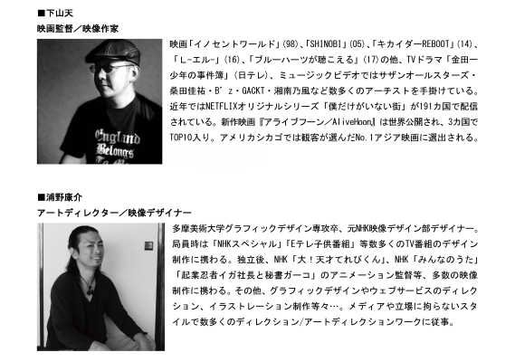 子供たちの映画作りをサポートしていただく講師として、本年も映画監督の下山天さんとアートディレクターの浦野康介さんをお招きいたします。
