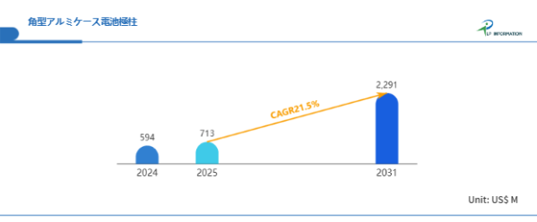 LP Information調査チームの最新レポートである「世界角型アルミケース電池極柱市場の成長予測2025~2031」(https://www.lpinformation.jp/reports/568107/square-aluminum-shell-battery-terminal-for-new-energy)によると、2025年から2031年の予測期間中のCAGRが21.5%で、2031年までにグローバル角型アルミケース電池極柱市場規模は22.91億米ドルに達すると予測されている。
