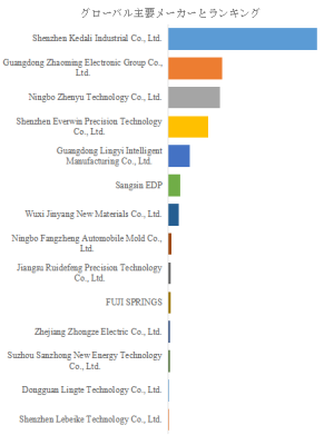 競争環境においては、性能・コスト・供給安定性が主要な優位性の源泉である。角型アルミケース電池極柱は高い加工精度と安定した導電性能が求められるため、技術障壁が比較的高い分野といえる。世界市場では、Shenzhen Kedali Industrial、Guangdong Zhaoming Electronic、Ningbo Zhenyu Technology、Shenzhen Everwin Precision Technology、Guangdong Lingyi Intelligent Manufacturingなどの企業が存在感を示しており、2024年には上位5社が全体の約77.0%を占める寡占的な構造となっている。日本市場においては、自動車OEMや電池メーカーとのサプライチェーン連携が競争上の重要な要素となる。加えて、コスト削減と同時に高信頼性を担保すること、さらに熱拡散や耐久性を強化する新技術の開発が各社の差別化戦略の中核となっている。近年は精密プレス加工、表面処理技術、複合材とのハイブリッド化など、多様な技術革新が見られ、地域別にも中国・韓国の大規模生産力、欧州の品質規格、日本の精密技術といった強みの違いが市場構造に反映されている。