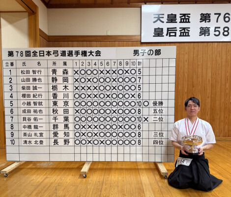 史上最年少での「天皇盃」制覇: 2025年9月、天皇盃 第76回全日本男子弓道選手権大会にて、初出場ながら歴代最年少の28歳で優勝。日本弓道界の最高峰を制した瞬間の想い。