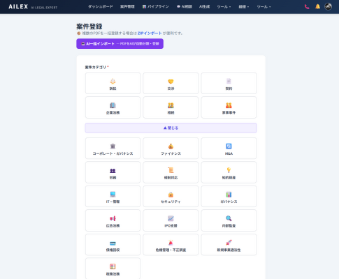 AILEXはこれまで、訴訟・交渉・契約・相続・家事事件・刑事など13種類の案件カテゴリに対応してきました。しかし、パイロット運用に参加する弁護士から「顧問先企業のM&A案件を管理したい」「IPO準備の進捗をフェーズで追いたい」「広告法務や情報セキュリティ案件の分類先がない」といった声が寄せられていました。