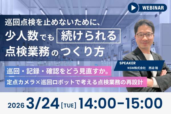 本ウェビナーでは、少人数でも無理なく“続けられる”点検業務に変えるための考え方を整理します。巡回・記録・確認といった業務を分解し、定点カメラや巡回ロボットの活用を例に、点検業務の現実的な再設計の進め方を具体的に解説します。