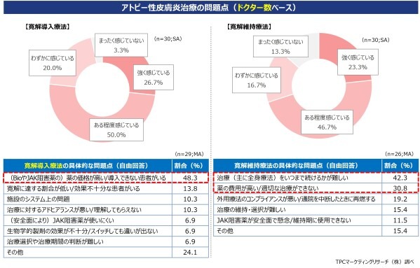 さらに、寛解導入・維持治療について、一定以上の課題意識を有しているドクターが多く、寛解導入治療では『費用により最適治療が選択できない』、寛解維持では『費用負担も考慮した治療継続期間の判断の難しさ』が中心的なアンメットニーズとなっている。