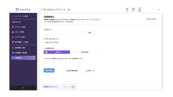 操作はエルグラムへログイン後、「マイページ」内にある「見積書発行」メニューより行えます。