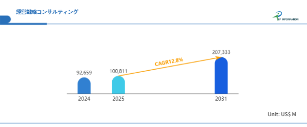 LP Information調査チームの最新レポート「世界経営戦略コンサルティング市場の成長予測2026~2032」(https://www.lpinformation.jp/reports/591953/strategy-and-management-consulting)によると、2025年から2031年の予測期間中のCAGRが12.8%で、2031年までにグローバル経営戦略コンサルティング市場規模は2073.33億米ドルに達すると予測されている。このデータは、世界的な企業経営の複雑化と変革ニーズの高まりが、経営戦略コンサルティング市場の力強い成長を牽引している現状を明確に示唆している。特に、DXの加速、サステナビリティ経営への移行、そしてM&A活動の活発化は、今後の市場拡大に大きく寄与する。このように、企業が直面する多様な社会課題と経営環境の変化への対応が、経営戦略コンサルティングへの需要を構造的に拡大させているのである。