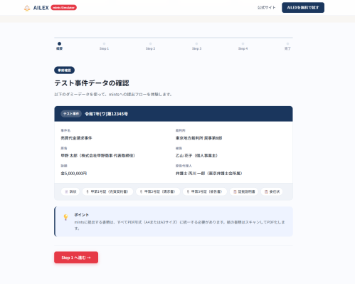 ※ 本シミュレーターはmintsの操作フローを模擬的に体験するための学習ツールであり、法的助言を構成するものではありません。実際のmints操作・訴訟手続については、必ず弁護士等の専門家にご相談ください。AILEXのAI機能による生成結果は「ドラフト」であり、最終的な法的判断および責任は弁護士に帰属します。AILEXは弁護士法第72条に定める法律事務の取扱いを行うものではなく、弁護士の業務を支援するツールとして機能します。