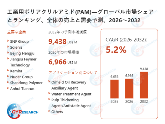 2025年における工業用ポリアクリルアミド(PAM)の世界市場規模は、6656百万米ドルと予測され、2026年から2032年の予測期間において、年間平均成長率(CAGR)5.2%で成長し、2032年までに9438百万米ドルに達すると予測されている。