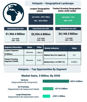 2025年において、サービス分野は市場全体の80.6%、1兆5,856億ドルを占め最大セグメントとなり、2030年まで年平均8.6%で成長する見通しである。導入形態ではオンプレミス型が83.0%、1兆6,327億ドルを占めたが、クラウド型は年平均11.7%とより高い成長率が予測されている。企業規模別では大企業が65.7%、1兆2,920億ドルを占める一方で、中小企業は年平均9.9%でより速い拡大が見込まれている。業種別では不動産分野が30.0%、5,900億ドルで最大であり、予測期間中は年平均9.6%で成長すると見込まれている。