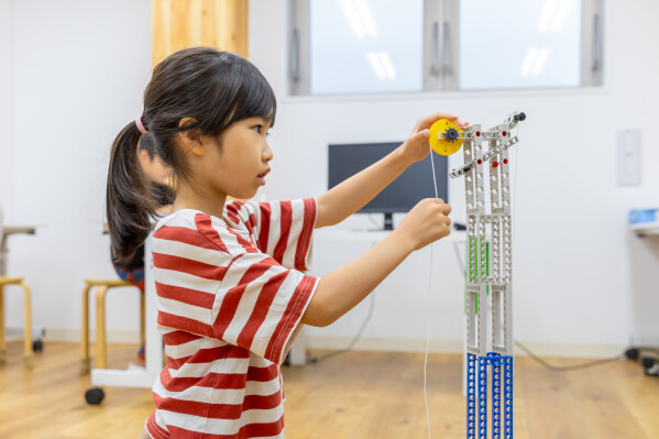 ブロックカリキュラム(16レッスン):「風力カー」「ビー玉ジャンプ」など、物理の仕組みをブロック制作を通して直感的に学びます。