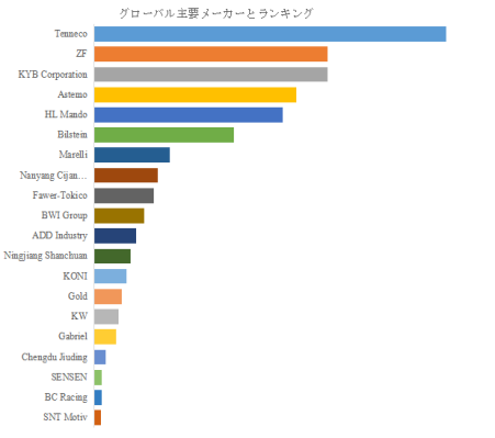 LP Information のトップ企業研究センターによると、ショックアブソーバーの世界的主要製造業者には、Tenneco、ZF、KYB Corporation、Astemo、HL Mando、Bilstein、Marelli など 23 社以上が含まれる。2025 年時点で世界トップ 20 企業は売上の約 88.5%を占めており、市場は中程度から高い集中度を示している。Tenneco が 18.02%の最大シェアを占め、ZF(11.96%)、KYB Corporation(11.95%)がそれに続き、トップ 3 企業で 41.93%のシェアを握る寡占的構造が部分的に存在する。