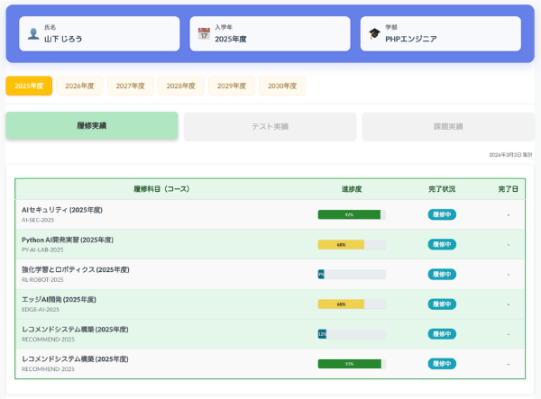 本機能では、「Moodle(ムードル)」にて学習した結果や途中経過を、「履修実績」「テスト実績」「課題実績」として自動的に集約し、入学から卒業までの学習プロセスを「成長の証明書」 として一元管理することを可能にします。これにより、大学等の高等教育機関における学習成果の可視化と、学生のキャリア形成支援を強力にサポートします。