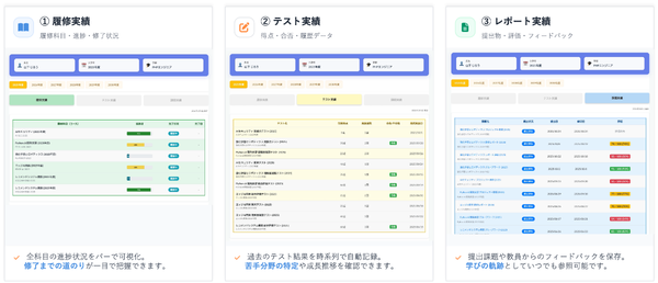 学生のポートフォリオは、「履修実績」「テスト実績」「課題実績」の3つのタブで構成され、 多角的に学習状況を振り返ることができます。