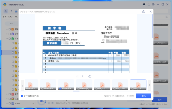 スキャンが始まると、消えたファイルがリストアップされます。復元したいファイルが見つかったら、ダブルクリックでプレビューして中身を確認できます。