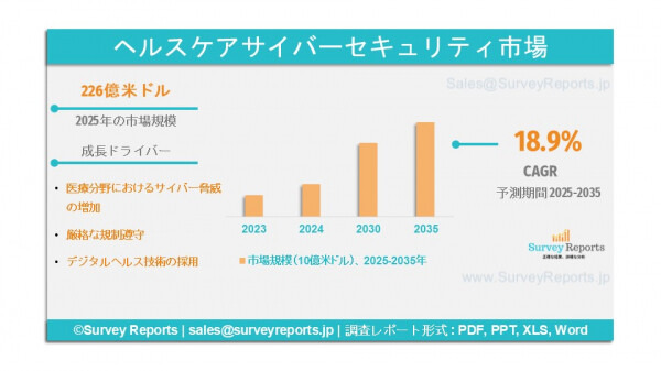 Surveyreportsの専門家が医療サイバーセキュリティ市場調査を分析した結果、2025年の市場規模は226億米ドルに達することが判明しました。さらに、医療サイバーセキュリティ市場のシェアは、2035年末までに856億米ドルに達すると予測されています。医療サイバーセキュリティ市場は、2025年から2035年の予測期間において、約18.9%のCAGR(年平均成長率)で成長すると見込まれています。