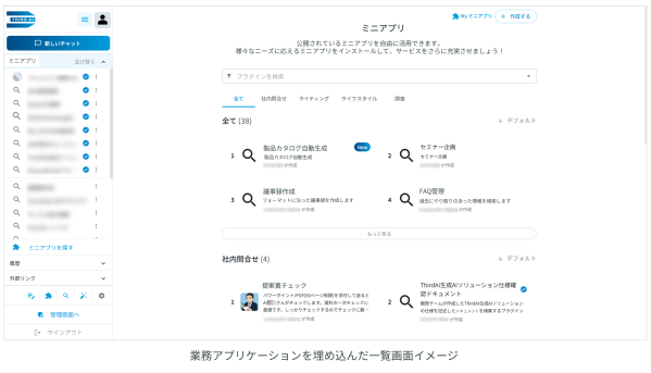 このような課題に対し、この度追加したミニアプリ機能では、「Third AI 生成AIソリューション」のプラットフォーム上に業務アプリケーションを表示することで、汎用チャット機能と業務アプリケーションを1つの画面上で並行して操作できるようになります。ツール間の行き来や画面切り替えによる中断が減ることで、生成AIを「使いたい時にすぐ使える」状態に近づけ、現場での活用促進・定着が期待できます。