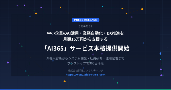株式会社BTNコンサルティング(本社:東京都中央区、代表取締役:亀田英佑、以下「当社」)は、中小企業向けのAI活用・業務自動化・DX推進支援サービス 「AI365」 の本格提供を開始いたしました。