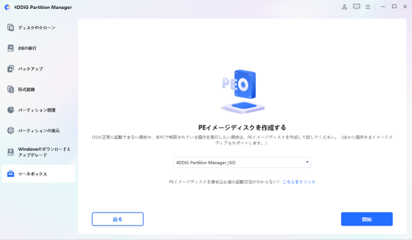 1.4DDiG Partition Managerを起動し、左側のメニューから「ツールボックス」を選択して「WinPE作成」をクリックし、「開始」を押すと、起動可能なUSBを作成できます。作成した起動可能USBをBitLocker回復画面をスキップしたいパソコンに挿入し、キーボード操作でブートメニュー(機種によって入り方は異なります)を開き、USBから起動を選択してPE環境に入ります。