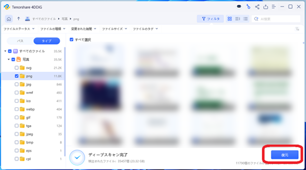 3:スキャン完了後、復元したいファイルを選択して「復元」をクリック。以上で完了です。