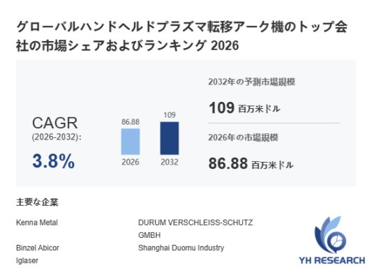 YHResearch調査チームの最新レポート「グローバルハンドヘルドプラズマ転移アーク機のトップ会社の市場シェアおよびランキング 2026」によると、2026年の86.88百万米ドルから2032年には109百万米ドルに成長し、2026年から2032年の間にCAGRは3.8%になると予測されています。
