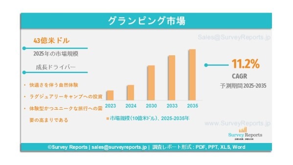 Surveyreportsの専門家はグランピング市場の調査を分析し、同市場規模が2025年に43億米ドルであったことを明らかにした。さらに、グランピング市場の売上高は2035年末までに103億米ドルに達すると予測されている。グランピング市場は、2025年から2035年の予測期間において約11.2%の年平均成長率(CAGR)で成長すると見込まれている。