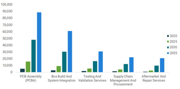 プリント回路基板組立が依然として製造活動の中心である一方、アフターサービスおよび修理サービスは今後数年間で最も急速に拡大すると予測されている。このセグメントは2025年から2030年の間に年平均成長率29.5%で成長すると見込まれており、機器使用の増加と製品保守、アップグレード、ライフサイクル管理サービスへの需要増加によって支えられている。