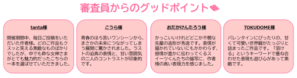 校則違反を口実にする女の子のいじらしさと、誠実で少し鈍感な風紀委員長のやり取りが、コミカルに微笑ましく描かれています。バレンタインらしい甘酸っぱさはもちろん、ホワイトデーへの期待感まで伝わってくるような、クオリティの高いご作品です。読み終わった後に幸せな気持ちになれる点も審査員一同の心に響き、高く評価させていただきました。