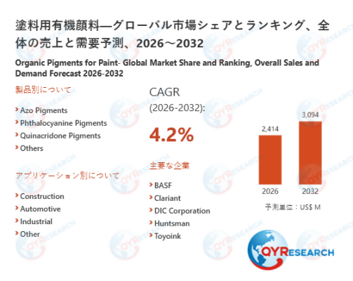 塗料用有機顔料の世界市場規模は、2025年には約2326百万米ドルに達すると推計されています。2026年には2414百万米ドル規模へと拡大する見込みであり、その後も安定した成長軌道を維持すると想定されています。2026年から2032年の期間においては、年平均成長率(CAGR)4.2%で推移し、2032年には市場規模が約3094百万米ドルに達する見通しです。