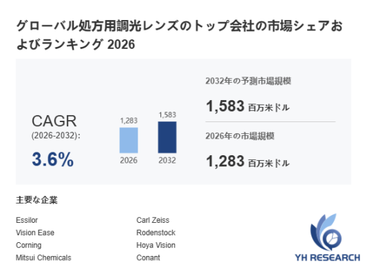 YHResearch調査チームの最新レポート「グローバル処方用調光レンズのトップ会社の市場シェアおよびランキング 2026」によると、2026年の1283百万米ドルから2032年には1583百万米ドルに成長し、2026年から2032年の間にCAGRは3.6%になると予測されています。