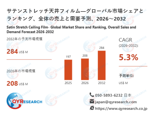 サテンストレッチ天井フィルムの世界市場規模は2025年に197百万米ドルに達し、2026年には208百万米ドルに拡大すると予測されております。2026年から2032年の期間においては、5.3%の年平均成長率(CAGR)を維持し、最終的に2032年の市場規模は284百万ドルに達すると予測されております。