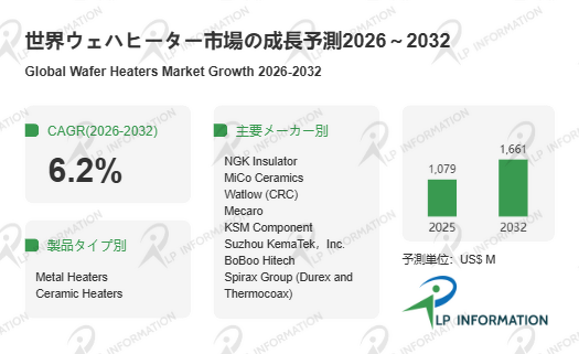 LP Information調査チームの最新レポートである「世界ウェハヒーター市場の成長予測2026~2032」(https://www.lpinformation.jp/reports/638149/wafer-heaters)によると、グローバルウェハヒーター市場は2026年から2032年にかけて年平均6.2%の堅調な成長を続け、2032年には16.61億米ドルに達する見通しである。特徴的なのは、単なる数量拡大ではなく、プロセス高度化に伴う機能価値の向上が市場拡大を牽引している点である。高精度温度制御、高熱伝導性、低パーティクル発生といった要件が、従来の金属系からセラミック系への移行を促し、単価上昇と収益構造の改善をもたらしている。とりわけ、AI・高性能計算(HPC)やパワー半導体など、熱プロセス負荷の高い分野で採用が増加し、市場全体が「性能主導型」へとシフトしていることが特徴である。