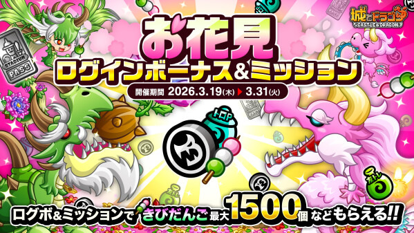 3月19日(木)より春のお祝いイベントとなる「お花見ログインボーナス」と「お花見ミッション」を開催いたします。ログインするだけできびだんご最大600個、さらにミッション達成できびだんご最大900個などを獲得できる特別なイベントになっていますので、この機会をお見逃しなく!