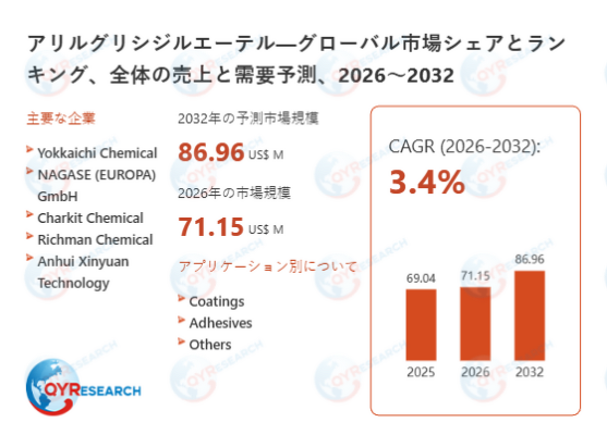 2025年におけるアリルグリシジルエーテルの世界市場規模は、69.04百万米ドルと予測され、2026年から2032年の予測期間において、年間平均成長率(CAGR)3.4%で成長し、2032年までに86.96百万米ドルに達すると予測されている。