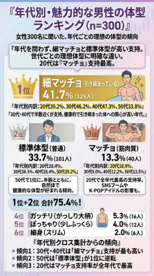 年齢を重ねるにつれ、鍛えた体よりも「自然体で健康的な体型」が好まれる傾向が見られます。また、20代は「マッチョ」の支持率が18.9%と全年代で最も高く、若い世代ほど筋肉を評価する傾向がありました。
