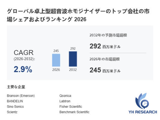 YHResearch調査チームの最新レポート「グローバル卓上型超音波ホモジナイザーのトップ会社の市場シェアおよびランキング 2026」によると、2026年の245百万米ドルから2032年には292百万米ドルに成長し、2026年から2032年の間にCAGRは2.9%になると予測されています。