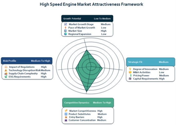 今後数年間で特定の分野が重要な価値を生み出すと見られています。1500~1800回転毎分のエンジンは収益成長に大きく寄与すると予測され、2~4メガワット帯も強い拡大が見込まれます。海洋分野は高効率推進システムへの需要増加により重要な機会領域となっています。地域別では、中国が産業および海洋インフラ投資の拡大により最大の成長をもたらすと期待されています。