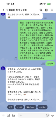 使い方はシンプルです。LINEまたはiOSアプリで「書き出す」と送ると、AIブッダ 禅は受け止めモードに入ります。その後、ユーザーは何度でも自由にメッセージを送ることができます。整った言葉である必要はありません。怒り、悲しみ、不安、後悔、どんな感情でも、感じたままの言葉で構いません。