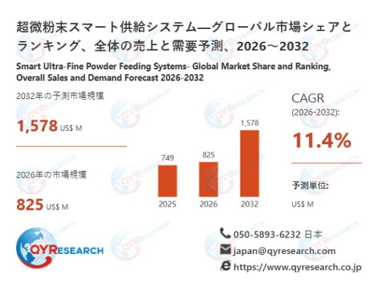 超微粉末スマート供給システムの世界市場規模は、2025年には約749百万米ドルに達すると推計されています。2026年には825百万米ドル規模へと拡大する見込みであり、その後も安定した成長軌道を維持すると想定されています。2026年から2032年の期間においては、年平均成長率(CAGR)11.4%で推移し、2032年には市場規模が約1578百万米ドルに達する見通しです。